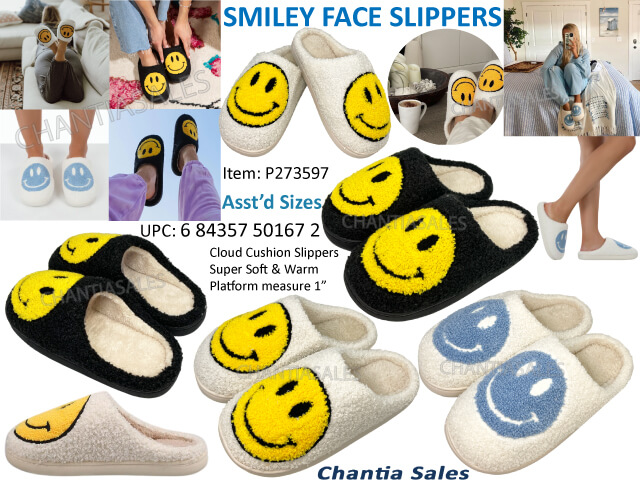 BF25 - FUZZY SLIPPERS - HAPPY FACE (Asst'd Sizes) #P273597