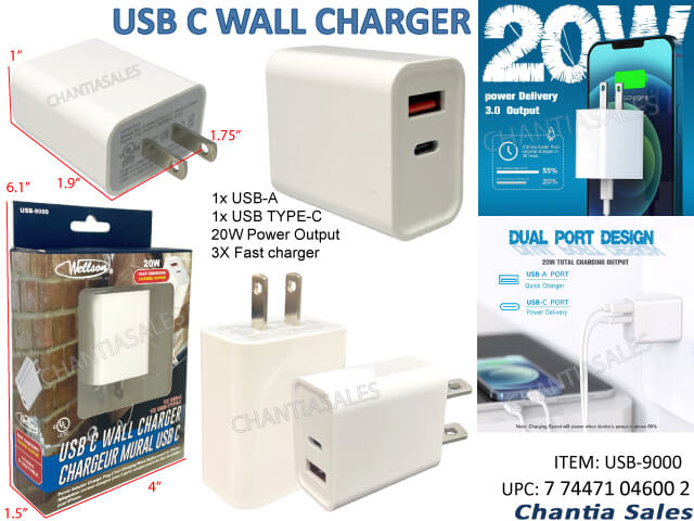 USB - C WALL CHARGER 20W (USB C-PORT & USB A) 3X FASTER CHARGER #USB-9000