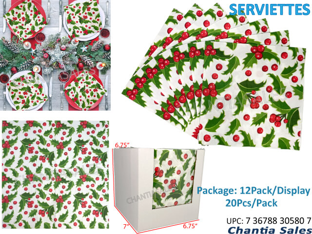 SERVIETTES CHRISTMAS - HOLLY BERRY #30580 (ETA Aug 30.)