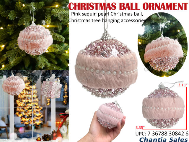 CHRISTMAS ORNAMENTS - SEQUIN PEARL W/PINK FUR (PLASTIC)